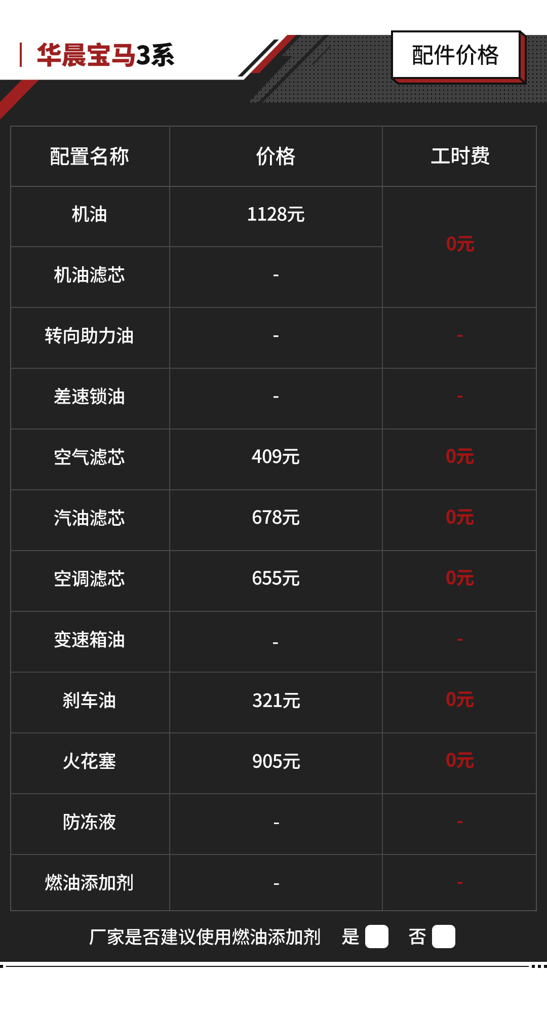 在配件价格上,宝马3系保持了豪华品牌高定位的特点,除了机油价格超过千元之外,其余的空调滤芯、汽油滤芯等耗材价格也均为不菲,与普通合资品牌完全不是一个级别的,所以教授认为,购买豪华车之前,首先要有配件价格上的心理准备。