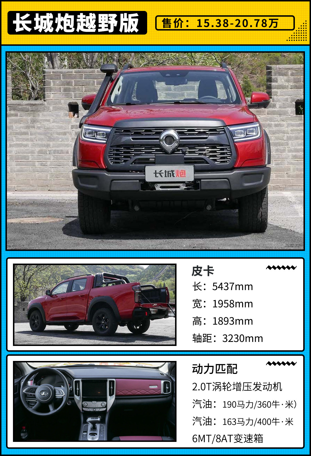 虽然说尺寸比F-150小了半圈,但长城炮越野版同样霸气,车长超5.4米,宽度超1.9米,加上硬朗的造型,回头率同样爆表。越野性能它同样不差,可选190马力的2.0T汽油发动机,或者更适合越野的、163马力的2.0T柴油发动机,同样是四驱还带有前后差速锁,价格还不到F-150的一半!