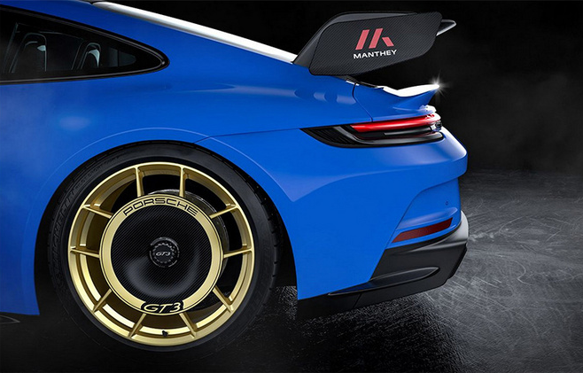 GT3特别版前后轮毂采用不同样式设计,两种金色饰面设计的点缀让GT3特别版极具个性。轮毂材质采用Manthey轻量OM-1化材质,后车轮还配备又气动圆盘。