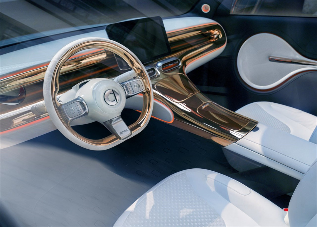 从前后三角形的贯穿式大灯和圆润的车身造型来看,smart精灵#1的确有些奔驰EQ家族的味道。内饰中控台的布局则比较常规,主驾驶位保留了小液晶仪表+HUD抬头显示,中控悬浮式屏幕为12.3英寸,整体以简约风格为主,类似特斯拉的设计。