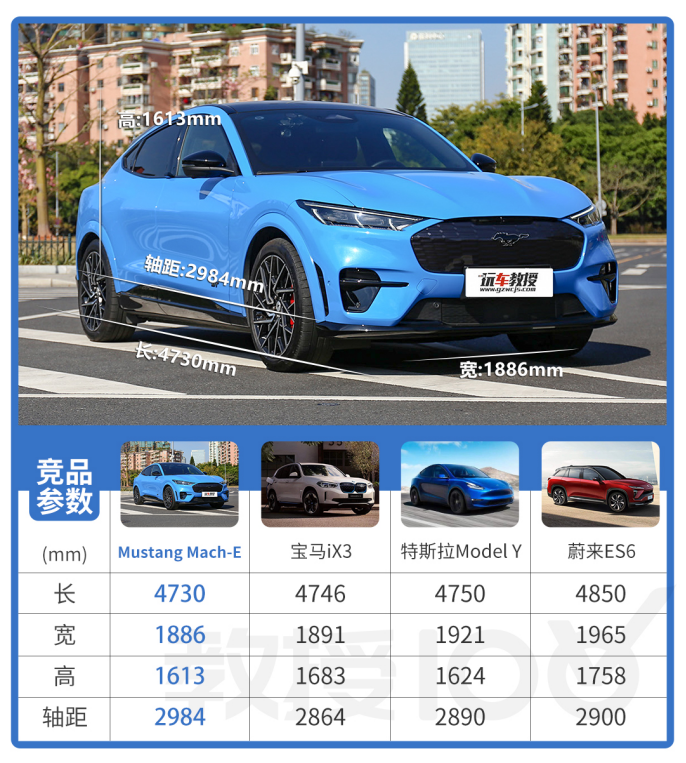Mustang Mach-E的车身尺寸在同级里面属于常规水平,其中轴距方面有领先优势,另外其溜背的车身造型也使得车高相比同级车型更矮。
