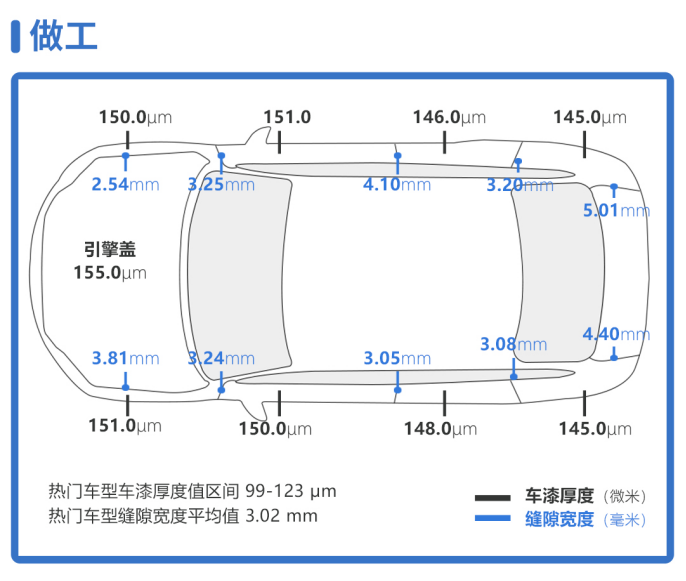 外观做工方面,车漆亮泽度很好,也比较厚,同时对称度较高。不过车身缝隙的表现就一般般,首先多处超过了平均值,而且左右对称度不高,特别是后备厢盖的右侧缝隙比较大。