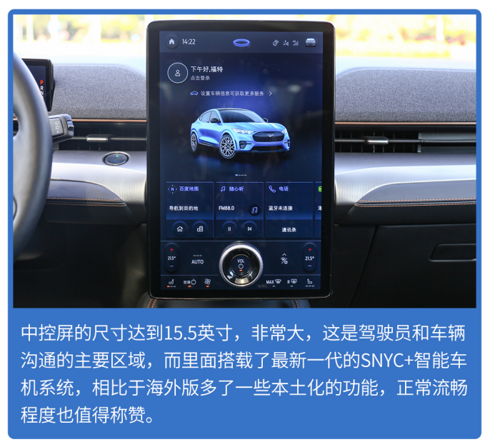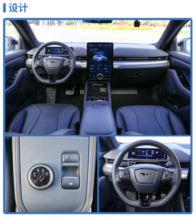 作为传统车企出身,Mustang Mach-E座舱设计依旧较为保守,并没有走超简约风格。不过仍然可以看到,车内搭载了超大竖置中控屏,基本上所有功能都归集在里面,因此车舱已经没有过多的实体按键了。另外电子换挡也是和部分福特车型一样,采用旋钮方式。