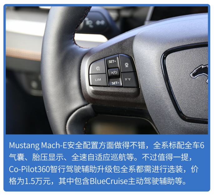除去GT First Edition版本,本次试驾的Mustang Mach-E GT版本基本算是车系的顶配了,售价达到36.99万元,所以配置方面该车型必然是丰富的,甚至可以将其与豪华品牌级别车型作对比了。