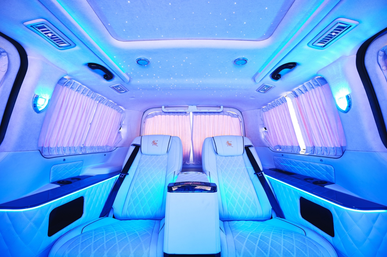 头顶则是星空顶,以及融入整车的氛围灯,脚踏则是高端酒店般的拼接式地毯,仿若豪华行宫。