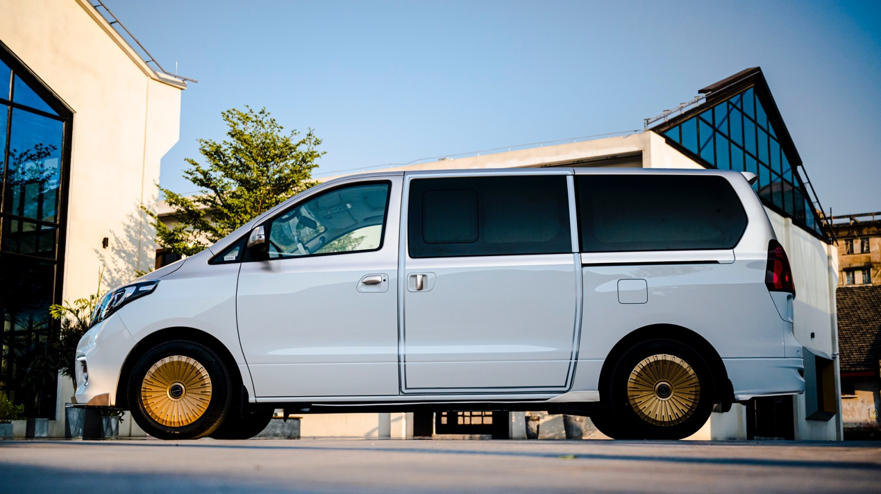 侧面来看还可以看到被视觉加强的电动侧滑门,还有仿若饼状的多辐式轮毂,视觉效果出色。