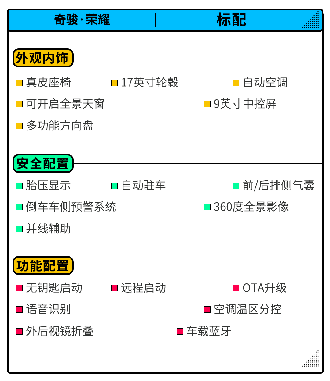 奇骏·荣耀的确在设计层面保持着不变,但其实奇骏·荣耀把所有的改变都放在了表面看不到的配置里。虽说仅推出两款车型配置,但是360全景影像、、倒车车侧预警系统、定速巡航、可开启全景天窗等功能配置成为了奇骏·荣耀的起步标配。换句话说,奇骏·荣耀最大的改变就是配置水平更加符合当下主流的消费需求。