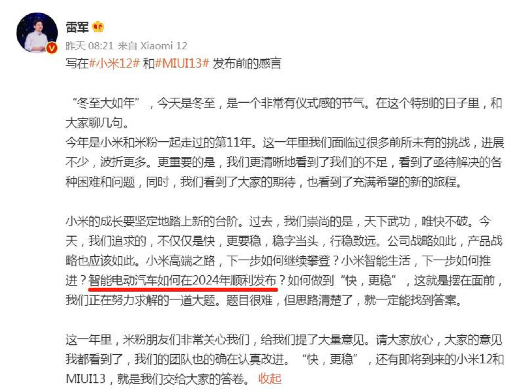 就如同俗话所说的那样,“理想很丰满,现实很骨感”。实际上对于小米汽车如何造、怎么定位,雷军本人也是较为茫然的。他在近日所发的一条微博上提到:“这是一道难题”。
