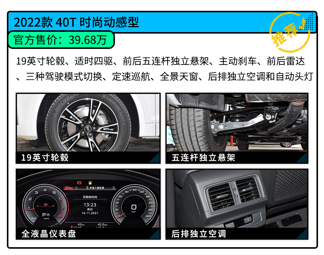 2022款奥迪Q5L共推出8款车型,售价区间为39.68-48.70万元。整体外观延续了老款车型的造型设计,唯一不同的就是RS套件速燃车看起来更运动,有奥迪RS系列车型味道。