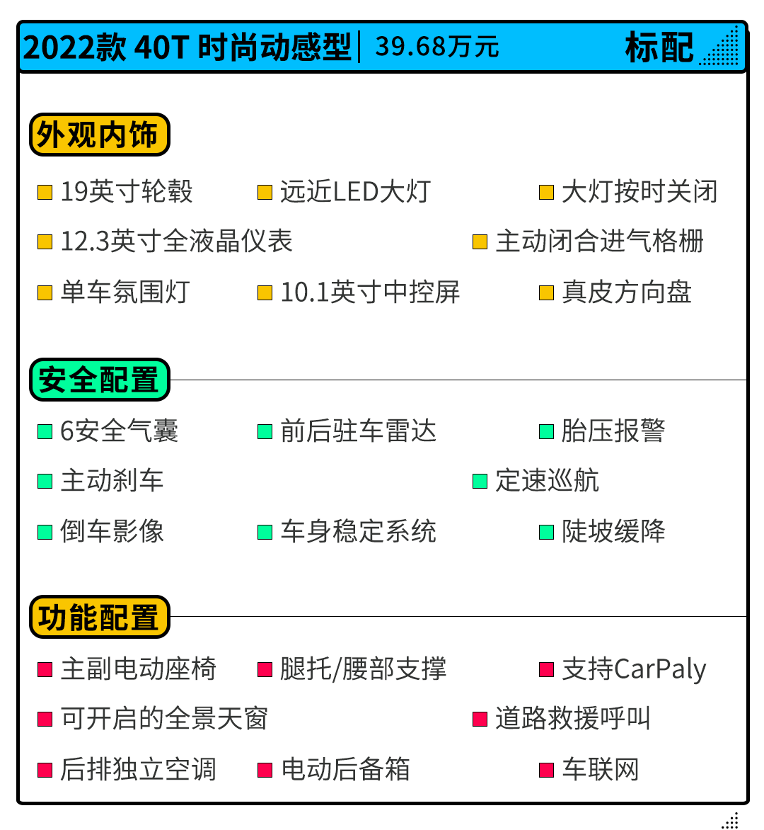 在配置方面,作为一款起售价近40万元的车型,厂家自然也给足了诚意,即便最入门级的时尚动感型,依然标配19英寸轮毂、前后五连杆独立悬架、远近LED大灯、主动刹车、全景天窗、电动后尾箱、主动闭合进气格栅、12.3英寸全液晶仪表盘、主副电动座椅、腰托/腿托、氛围灯和后排独立空调出风口等,性价比非常高。
