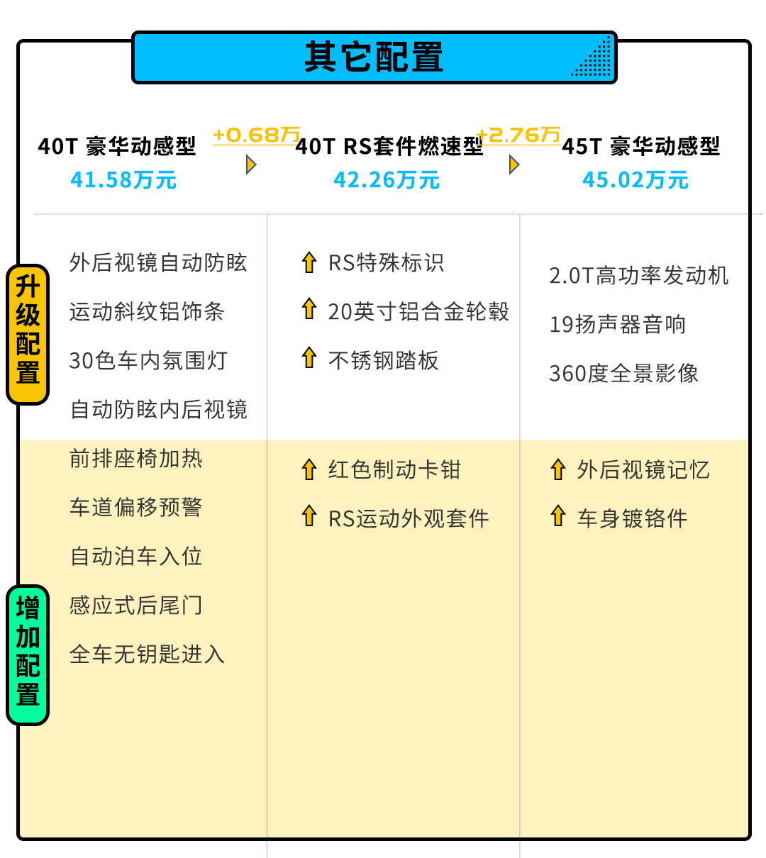 至于豪华动感型,需要多花1.9万元,增加前排座椅加热、自动泊车、全车无钥匙进入、车道偏移预警和30色车内氛围灯等一些舒适性配置,性价比并不是很高。还不如再加多6800元选择新出的RS套件燃速型,配置增多的同时,外观提升更明显,开出去更能体现高配车型带来的虚荣感。