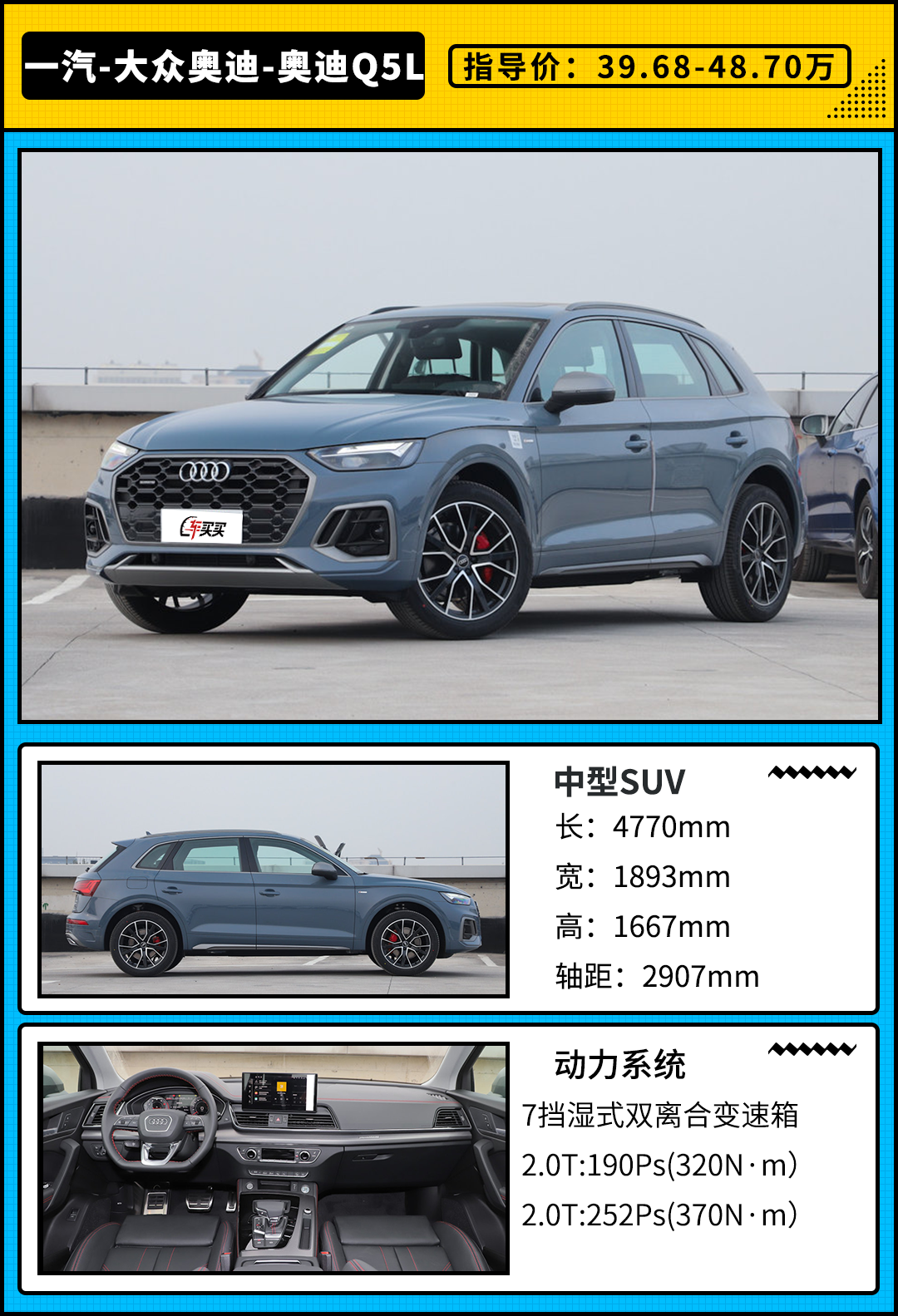 动力方面,新款奥迪Q5L将继续搭载现款车型的动力系统,全系搭载2.0T发动机,分为高低两种不同调校,最大功率分别为252马力和190马力,峰值扭矩分别为370牛·米和320牛·米,传动系统均匹配7速湿式双离合变速箱,高配车型还会配备quattro ultra智能四驱系统。