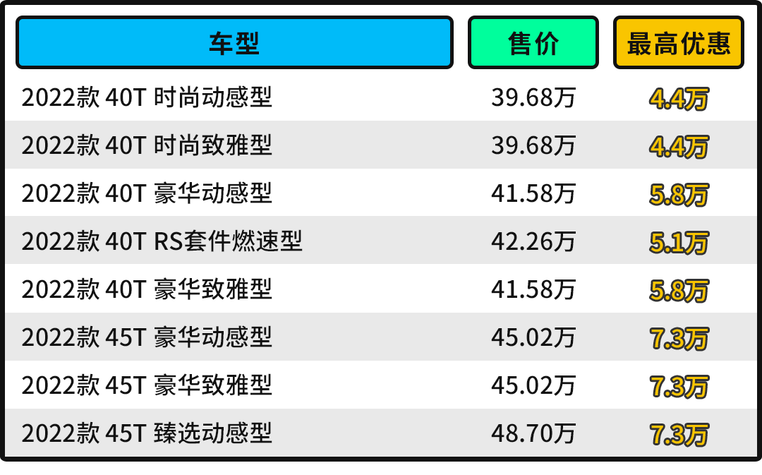 而至于45T车型,虽然动力提升显著,但跨度太大,比入门版车型都贵了5.34万元,显然并不是很划算。而且从市场销售情况来看,大部分用户选择的都是40T车型,图的就是实惠,不然都考虑宝马X3和奔驰GLC去了。所以综上所述,最入门版性价比是最高的,其次是新推出的RS套件燃速型,当然如果是注重动力表现且预算真的很充足,45T车型肯定是最好的。