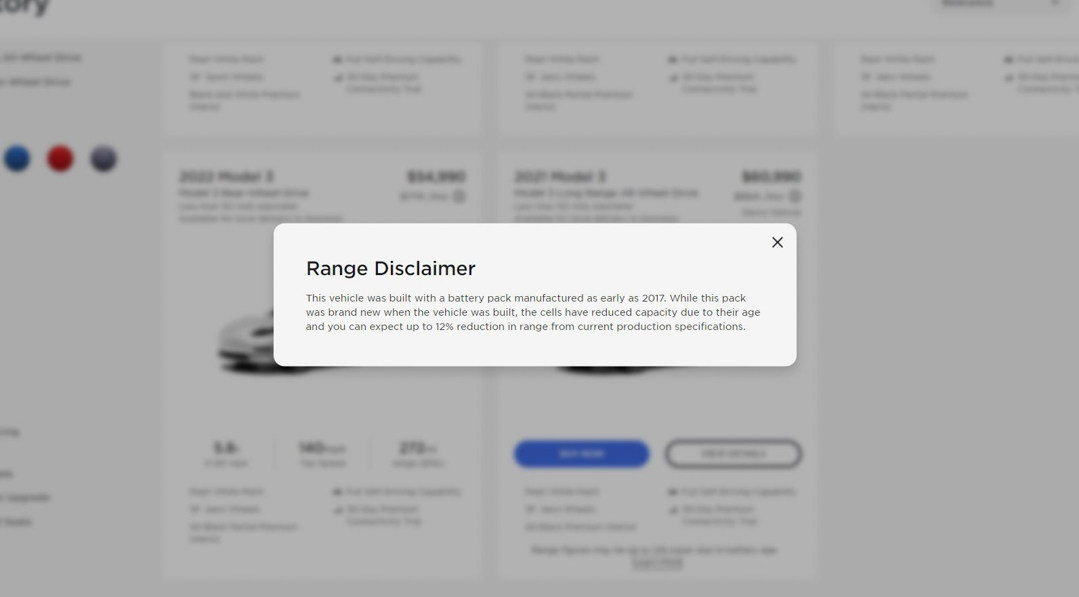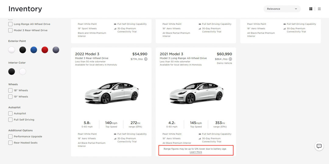 近日,有美国地区的消费者在特斯拉官网上发现,其正在出售使用了2017年生产的电池组的2021款Model 3新车,并且在车辆下方,官方注释写道:车辆使用了2017年的库存全新电池,相比目前的新车,在续航里程方面大约会有12%的下降。