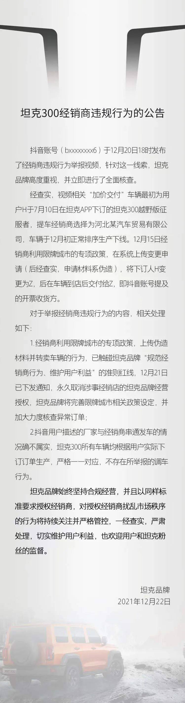 近日,长城坦克品牌收到了关于群众的举报,内容是关于某经销商存在违规行为——上传伪造材料(信息变更)并转让车辆,也就所谓的“加价交付”。长城坦克品牌决定,将永久取消涉事经销商的坦克品牌经营授权。