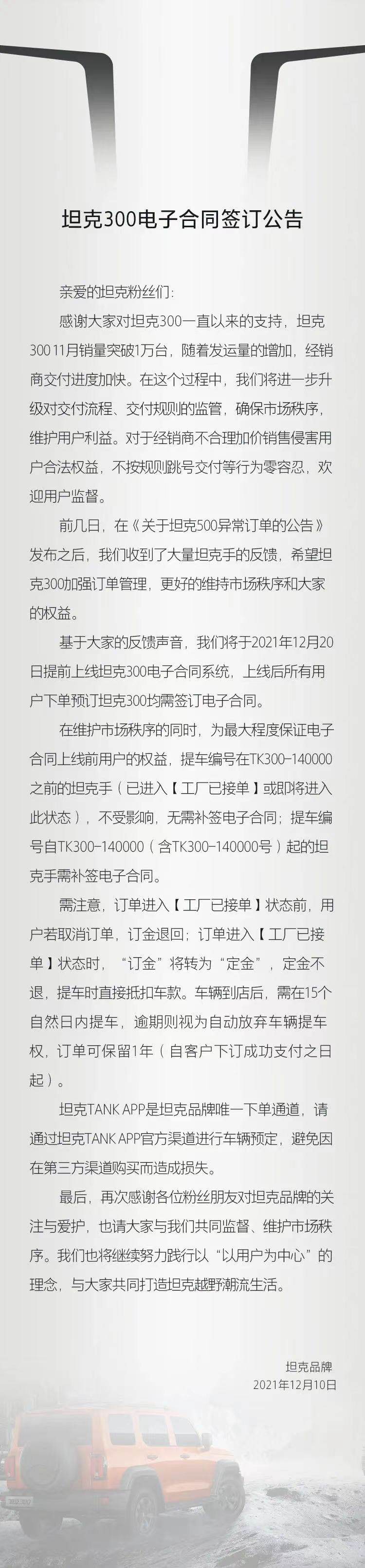 用户在购买坦克300前需签订电子合同,而订单一旦进入工厂已接单的阶段,“订金”会转变为“定金”提车时直接抵扣,同时车辆到店后,需在15个自然日内提车,否则视为放弃自动提车权。