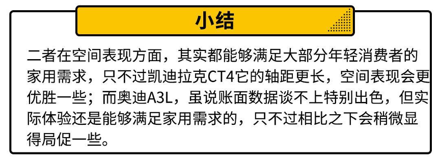 不过根据此前的试乘试驾体验来说,奥迪A3L的后排并不逊色于CT4,还是能够找到相对合理的坐姿,对于不是人均1.9米的家庭来说是够用的存在,毕竟它是一辆前置前驱车辆,在空间利用方面还是稍好于CT4这后驱车型。