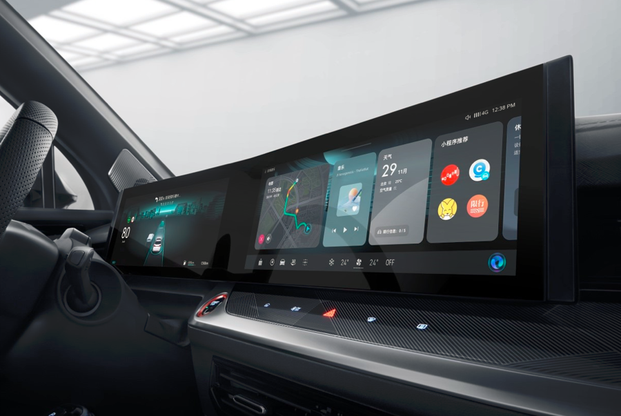 内饰设计以“赋智能以情商,赋空间以情感”为主题,采用一体式中控台设计,首次搭载了双12.3英寸大联屏,取消传统的物理按键,搭配全新设计的方向盘与山河纹电子档杆,使整个内饰呈现出简约而不简单的智慧科技美感。