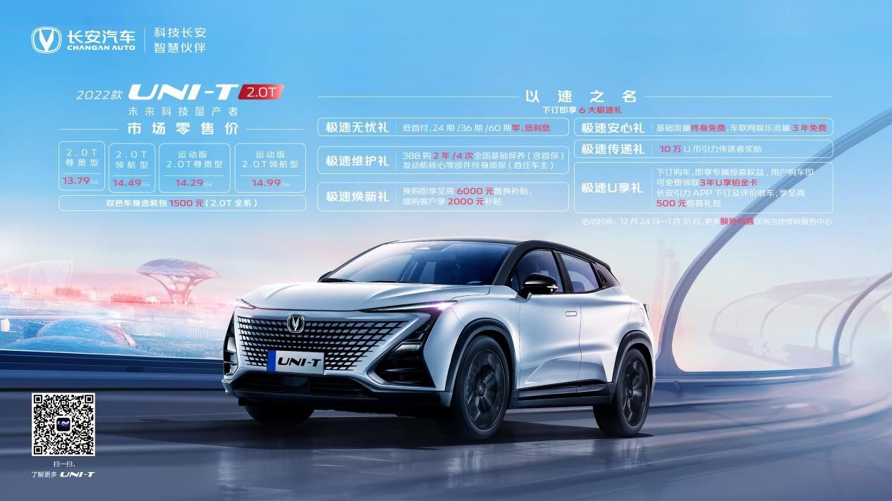 不枉“性能玩咖”用户期待,与长安2022款UNI-T 2.0T官方售价一同发布的,还有六项“极速”惊喜政策。低首付,24期/36期/60期零、低利息;388购2年/4次全国基础保养(含首保)发动机核心零部件终身质保(首任车主);换购即享至高6000元置换补贴,增购客户享2000元补贴;基础流量终身免费,车联网娱乐流量3年免费;10万U币引力传递者奖励;下订购车,即享专属惊喜权益,用户购车即可免费领取3年U享铂金卡,长安引力APP下订及评价收车,享至高500元惊喜礼包。