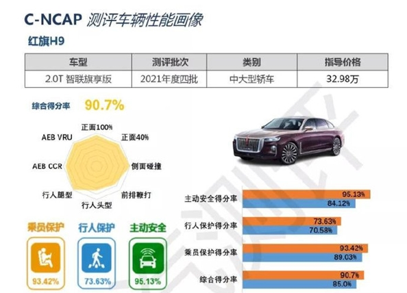 通过以上的结果来看,红旗H9在主动安全、乘员保护和行人保护这三个大项中都获得了十分不错的成绩,综合得分率高达90.7%,达到了C-NCAP“五星级”标准。