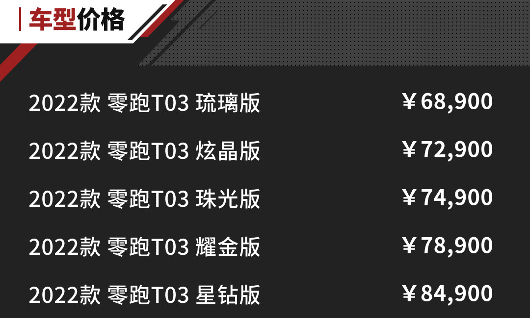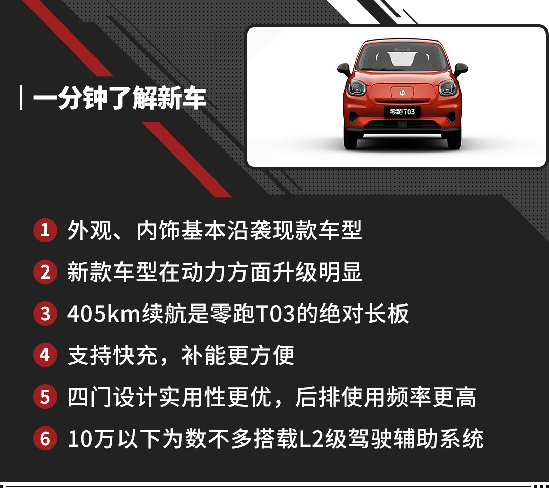 2022款零跑T03 403km续航车型动力全部升级为80kW,最大158N·m的扭矩,动力总成工作效率达到92.6%。