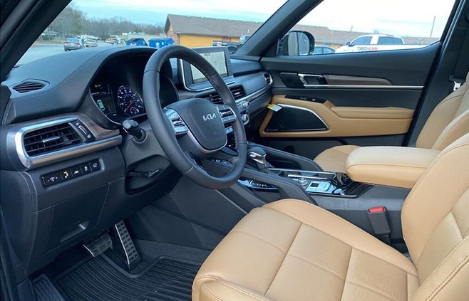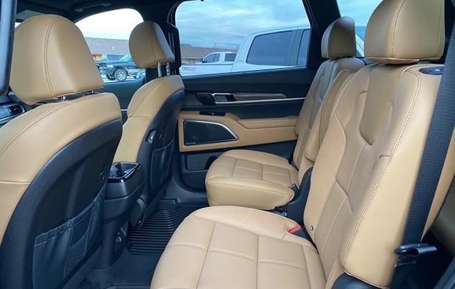 相比外观方面的硬汉形象,起亚Telluride内饰部分则是满满的居家风格,肌肤能触碰到的地方均采用了大面积皮革进行包裹,同时在中控台还配备了深棕色木纹面板,在豪华感方面确实营造得不错。