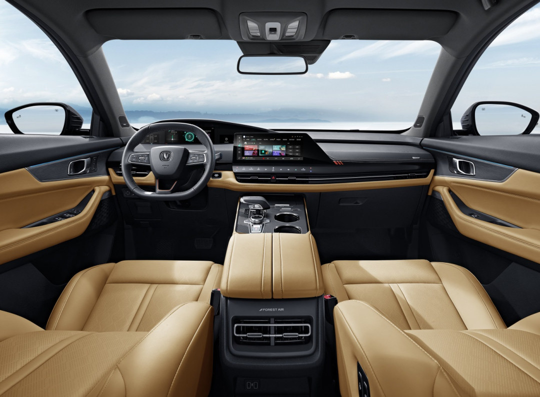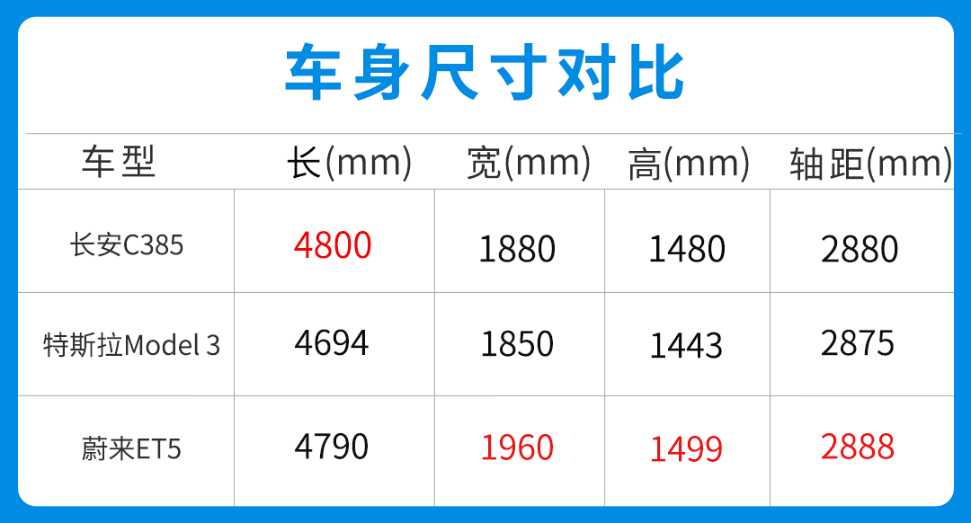 车身尺寸方面,新车长宽高分别为4800/1880/1480mm,轴距为2880mm,达到了中型车的标准,比特斯拉Model 3的尺寸更大,与最近推出的蔚来ET5相当,考虑到长安汽车的战略,新车预计定位为A+级纯电动轿车,以此来降维打击。