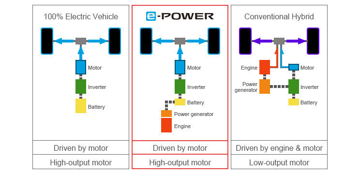 Nope!在这里我们首先要明白e-POWER混动的整个工作原理。虽说e-POWER混动同样是采用内燃机加驱动电机的搭配,但有别于两田混动的是,它的发动机是不直接参与工作的,而是100%由驱动电机作为输出来源,内燃机只用于发电。