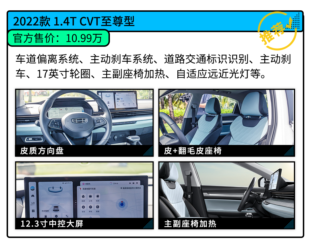 低配车型并没有配备主动安全系统,对于新手小白以及部分女司机来说确实难以应付,若然购车预算十分充足,买买君并不建议够买低配车型。此次买买君则十分推荐1.4T CVT至尊型版本。此版配备了众多安全配置,其中包括车道偏离系统、主动刹车系统、道路交通标识识别、主动刹车等功能,另外17英寸轮圈、10.25英寸液晶仪表、主副座椅加热、自适应远近光灯等实用的功能,这1万元看起来好像不怎么贵,并有着极高的性价比,确实值得买买君推荐。