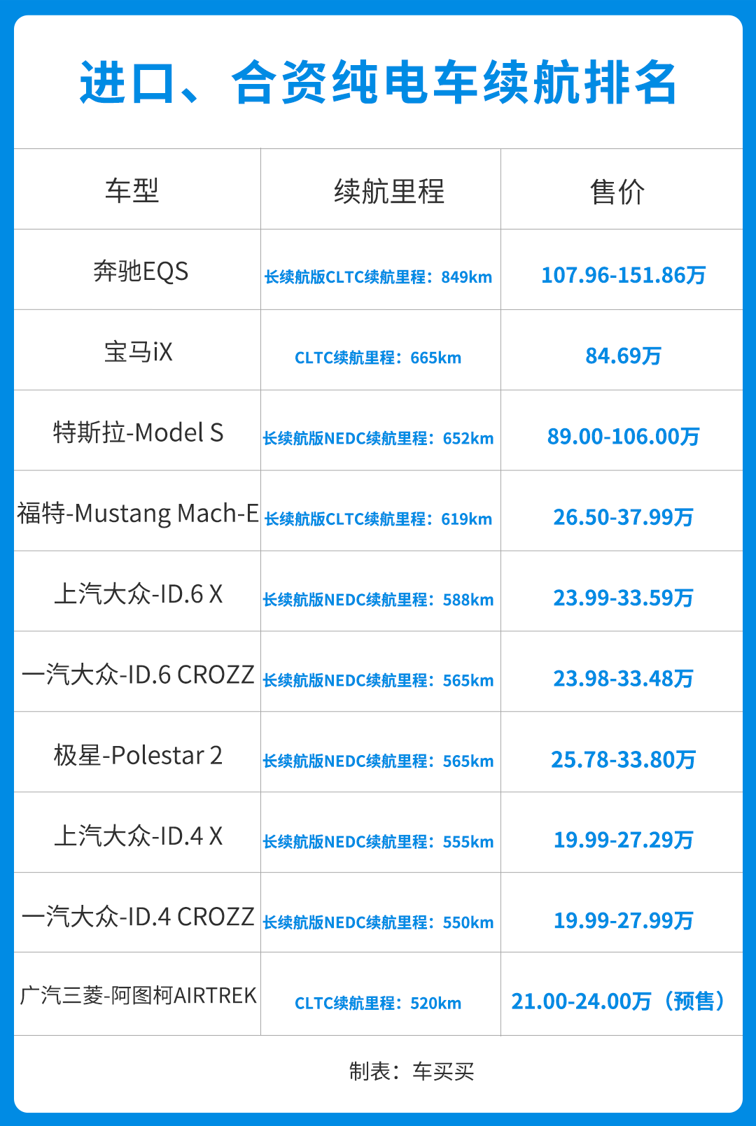 此次盘点的10款合资品牌、纯进口品牌的纯电动车仅是冰山一角,国外市场上还存在着众多巡航能力强的纯电车型。那么,以上列举的纯电动车哪款是你们的“心中所向”,不妨在评论区告诉买买君。