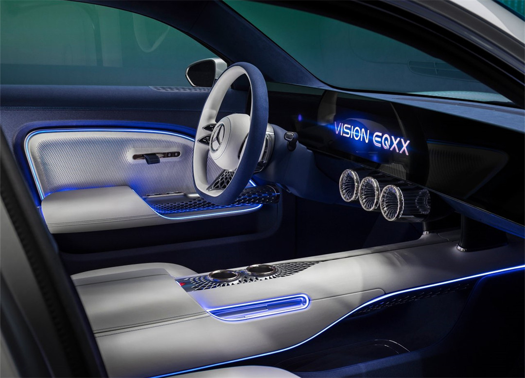 内饰的设计造型以简洁为主,方向盘、空调出风口、中央扶手都和现款的奔驰车型相似。亮点是这个贯穿了中控台的一整块47.5英寸屏幕,分辨率达到了7680*660像素,且在智能交互方面有了很大提升。内饰用料方面采用了轻量化的可持续性材料,这种环保材料的使用也是未来汽车要攻克的重点之一。