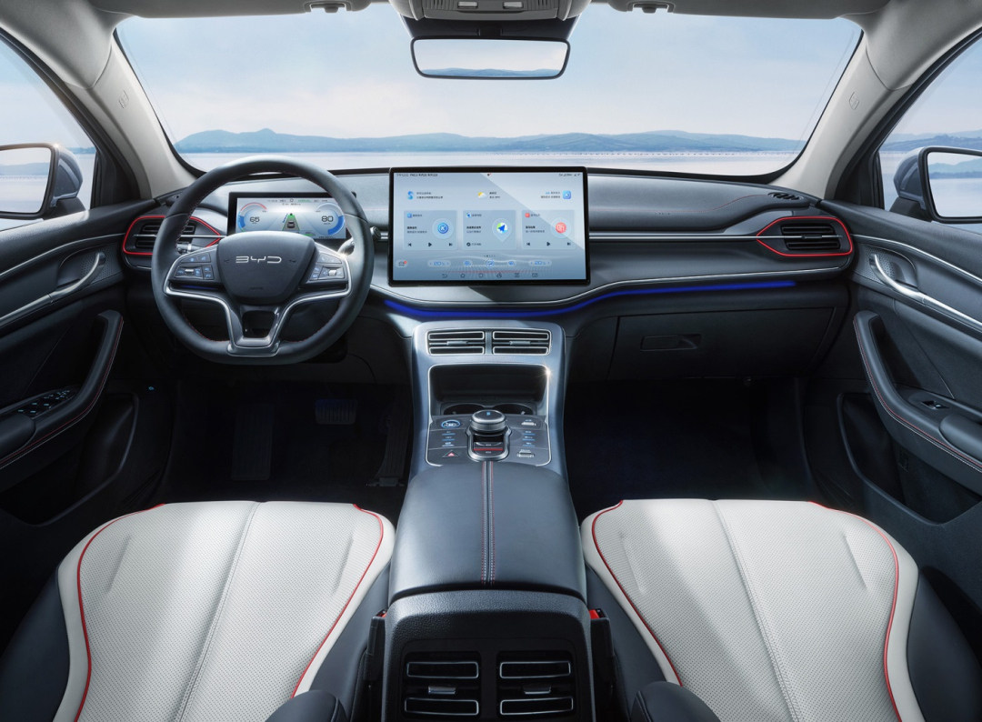 车身尺寸方面,新车长宽高分别为4780/1837/1495mm,达到A+级水平,不过其轴距仅为2718mm,在同级别里中规中矩。内饰上,依然是采用比亚迪家族式设计语言,配备了8.8英寸的全液晶显示屏与三辐式多功能方向盘,并搭配15.6英寸的悬浮式多媒体触控屏,该屏幕同样配备了自适应旋转技术。