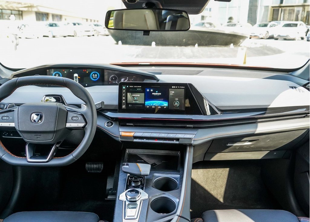 除了颜值高,长安UNI-V的内饰也非常豪华富有科技感,采用了触动心弦的可视化设计,赛车般的全液晶仪表盘、富有运动感的方向盘、悬浮式的中控屏以及颇为高级游艇式电子挡杆,层次感非常丰富。