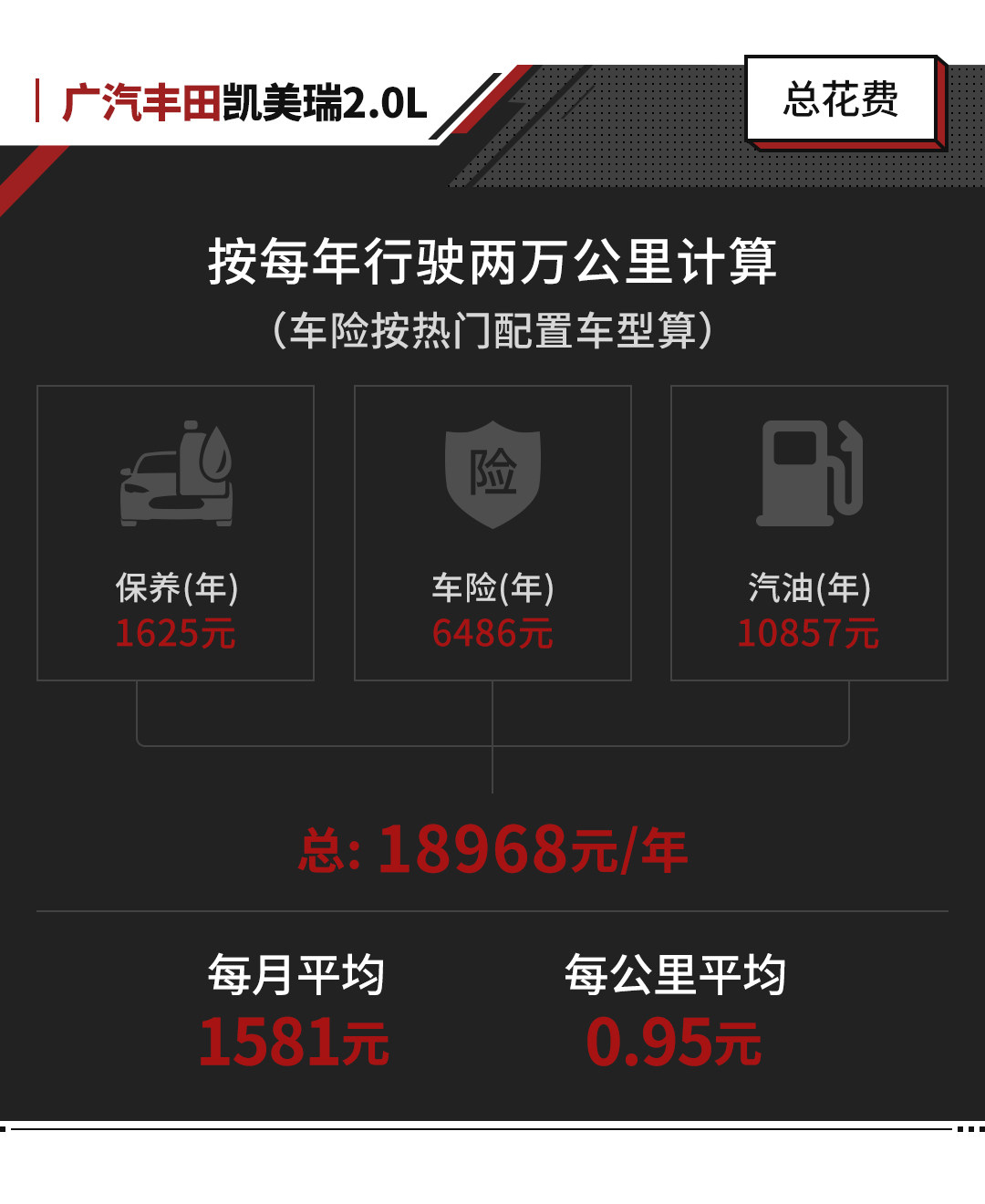 在综合用车成本方面,在将保养、车险、油费三巨头合计之后,按照每年行驶两万公里计算,凯美瑞2.0L汽油版车型一年成本大约需要18968元,平均每公里0.95元,相比同级美系车每公里超过1元的成本,还是比较实惠的。