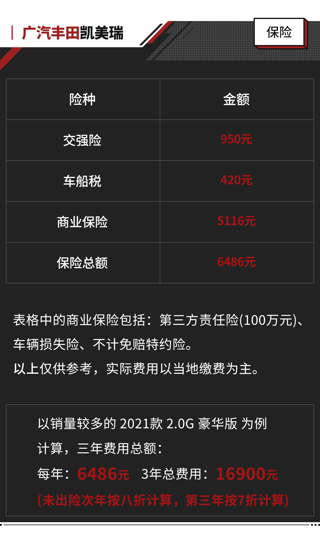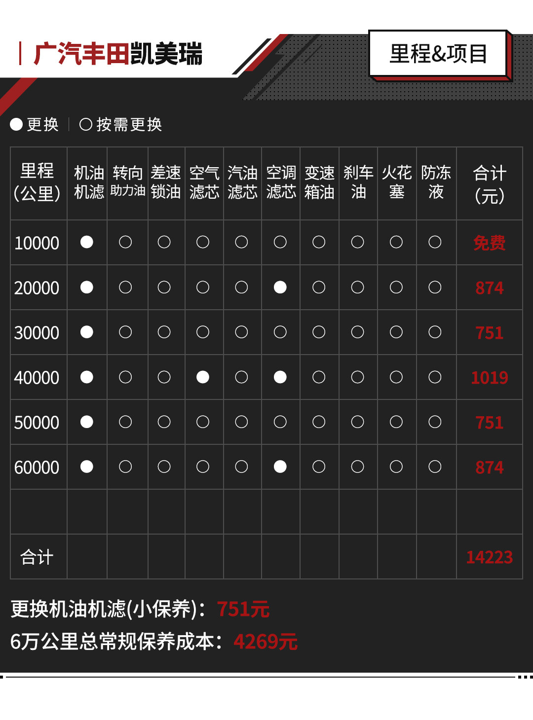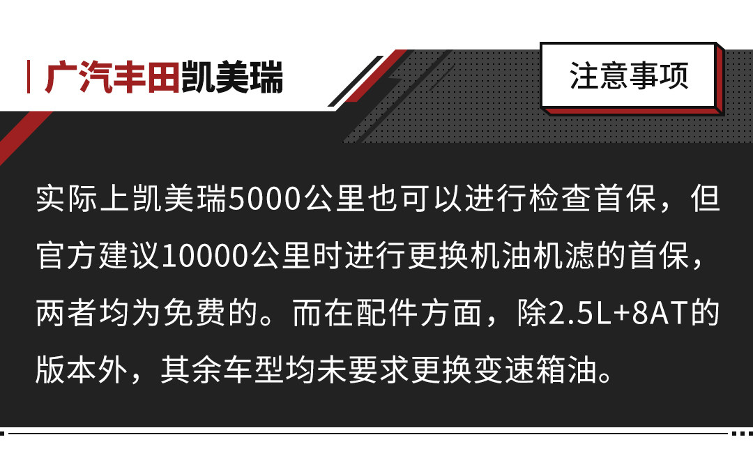 值得注意的是,凯美瑞的双擎版及汽油版车型保养费用是基本一致的,唯一的不同就在于2.5L+8AT车型要求在16万公里时更换变速箱油,费用大约为421元,并不算贵。