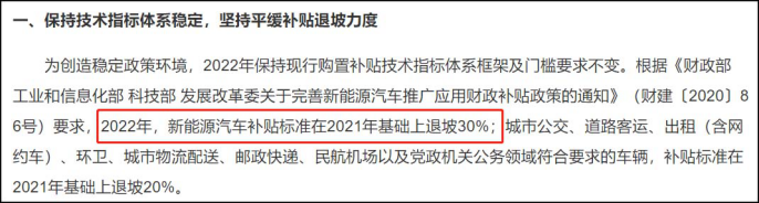 《2022年新能源汽车补贴政策》就明确了:2022年的补贴较2021年退坡30%,并宣告到2022年12月31日补贴退出。