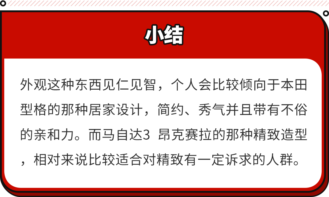 但是!倘若对手动挡“过敏”或者是只考虑自动挡,那么本田型格的6MT则会变成它的短板,这时候马自达3 昂克赛拉则会是你的更优选!