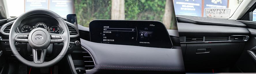 同样地,马自达3 昂克赛拉的内饰设计也十分简约,就连中控屏幕都设计得那么的细长娇小,当然也有不少人吐槽它小气。但好在它在用料方面也十分舍得,皮质材质包裹的地方很多,在某种程度上会给人有一种小资的错觉。