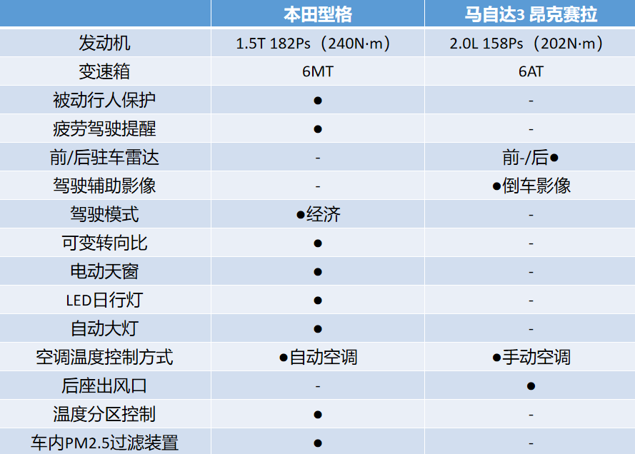 在这个价位,如果是单纯论配置的话,必然会更推荐选择本田型格。虽然配置谈不上特别丰富,但也足以应付日常的家用需求。而在对比之下,本田型格配置还更优于马自达3 昂克赛拉,同时它配备的还是6MT的变速箱,会有更强的参与感,驾驶乐趣也会倍增。