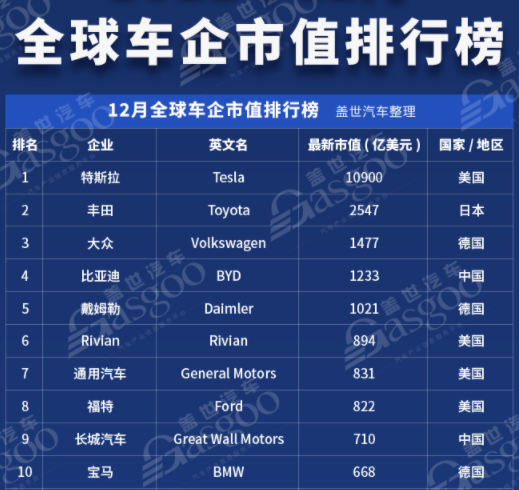 而在近期公布的全球车企市值排行榜中,特斯拉以10900亿美元的市值毫无悬念地夺冠,比起2-10名相加的市值还要多。真正的一个打十个。