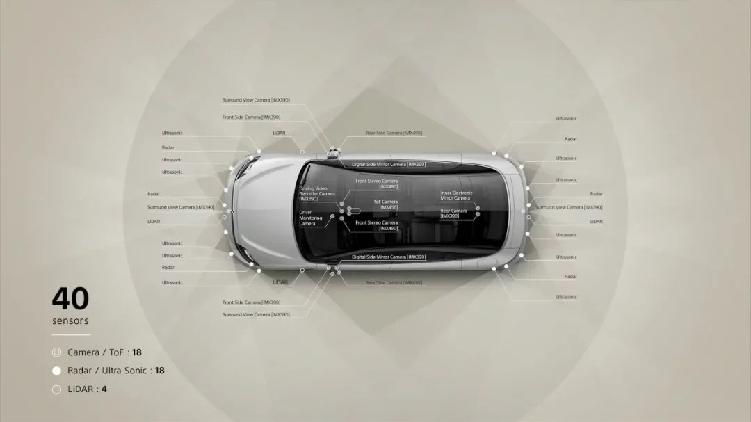 整车配备了40个传感器,全车18个摄像头、18个毫米波雷达以及4个激光雷达