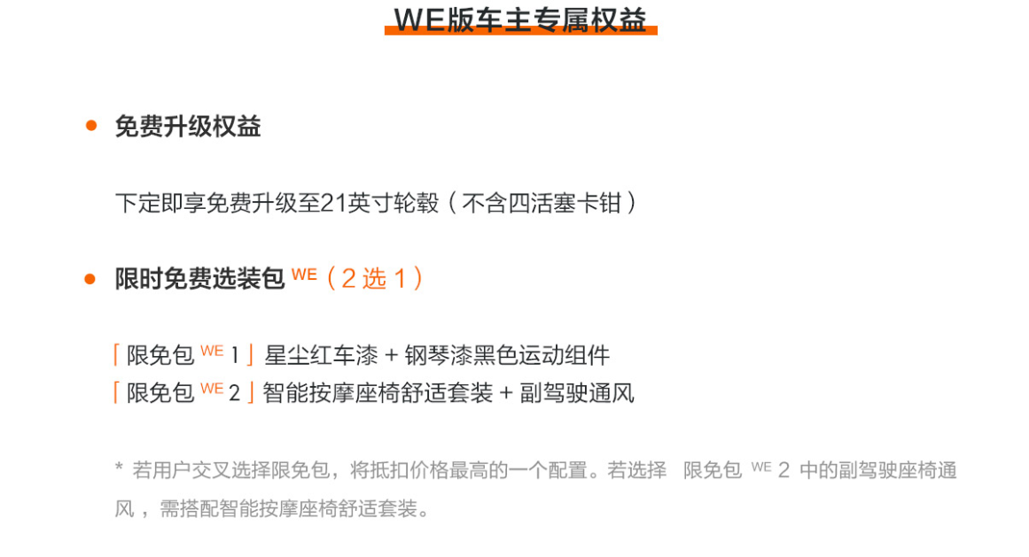 第二:对于2021年订车并且愿意继续等待极氪的车主,保持2021权益不变的同时,享受【红色车漆+钢琴漆黑色运动组件】或【智能按摩座椅舒适套装+副驾驶通风】二选一。同时开放15%首付3年年化费率2.99%给2021年未交付大定用户;2021年下定YOU版车主也应当享有自由选择充电权益2选1的权利;交付时间应当明确具体月份。(注:按照第一次下定的日期排单、不接受重新排单、不接受签署补充协议后续不再改单)