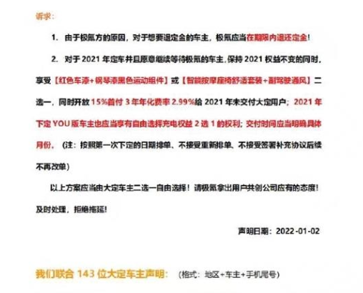 纸是包不住火的,陆陆续续有更多在2021年下订的车主发现自己上当了,于是就联合起来一起维权,并提出了以下两点诉求: