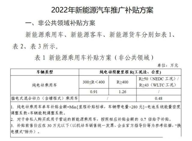 2022年新能源汽车购置补贴政策自2022年1月1日起执行,将于12月31日终止。新补贴方案明确了不同类型、不同领域车辆产品的补贴标准,包括续航里程大于等于300km且小于400km的车型补贴9100元,续航里程大于等于 400km的车型补贴1.26万元。插电式混合动力(含增程式)乘用车,纯电动续航里程≥ 50(NEDC工况)或纯电动续航里程≥ 43(WLTC工况)补贴4800元。