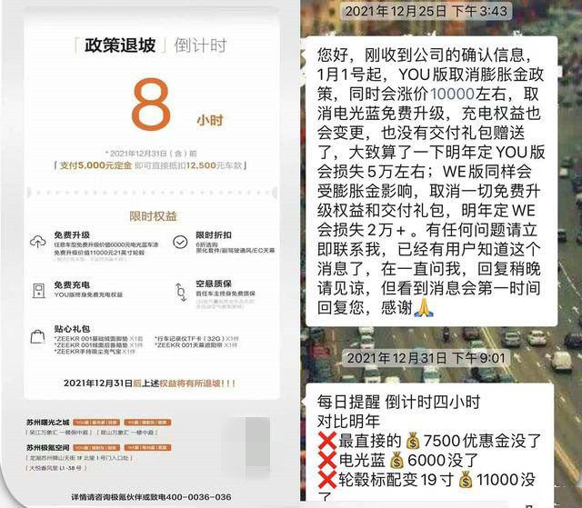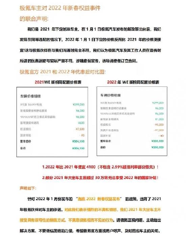对此,极氪相关人士回应称,“不同时期,优惠政策和之前有所不同我们可以给2021年的客户重新选择的机会。作为解决方案,极氪允许用户可以选择维持2021年下定时的所有零售权益,也可重新选择2022年新春限时购车权益。