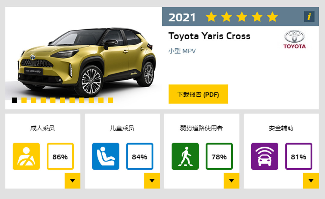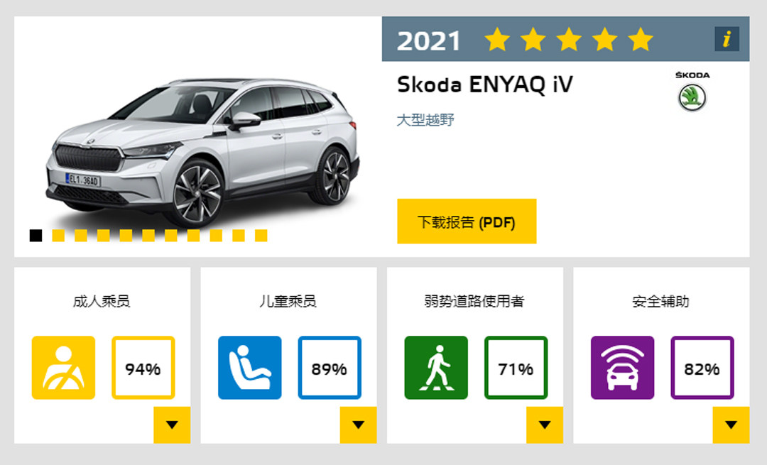 获得2021年E-NCAP最佳车型的分别有:奔驰EQS、斯柯达ENYAQ iV、海外版斯柯达晶锐、丰田YARiS Cross以及海外版日产逍客。