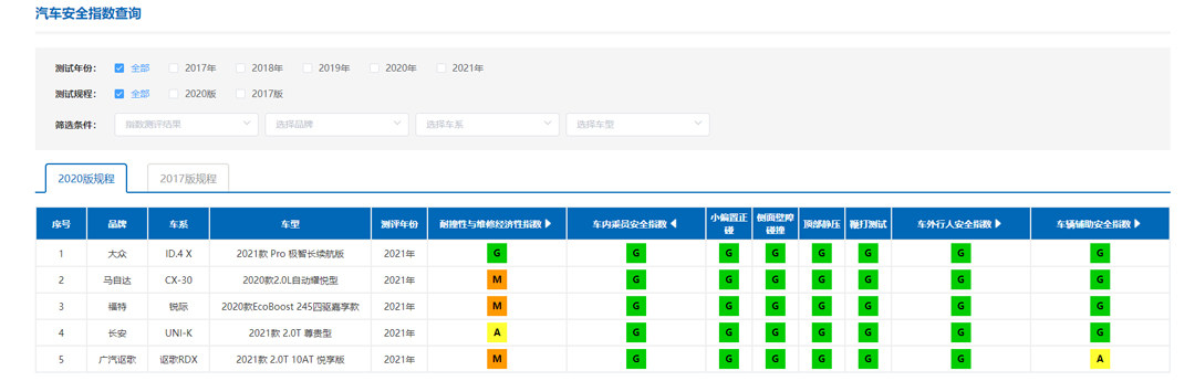 中保研相比起C-NCAP更加简单粗暴,直接公布车辆的得分情况,虽然根据不同得分分为G、M、A、P四个等级,但具体的数据在“汽车安全指数查询”中无法体现。