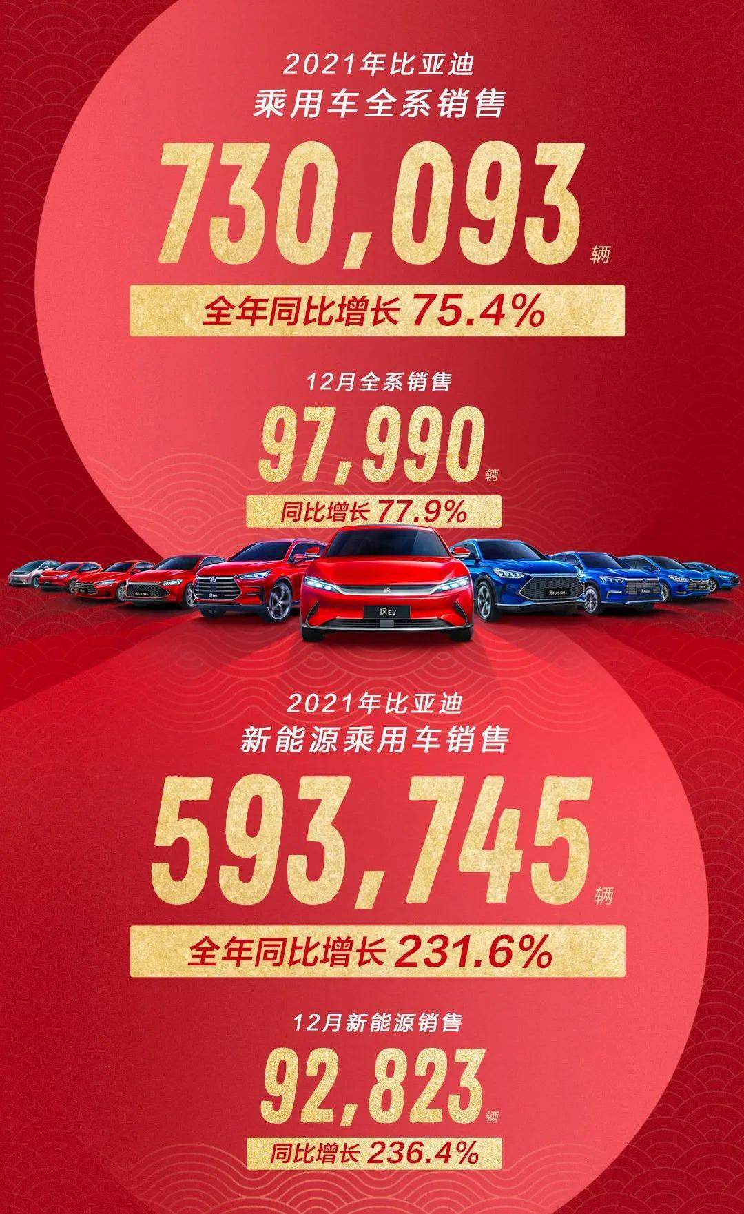 而中游市场代表——比亚迪汽车,新能源乘用车全年累计售出593,745台,全年同比增长231.6%,更是创下新能源汽车销量的历史新高,二者联合发力,新能源汽车的销量自然也会蹭蹭地往上涨。
