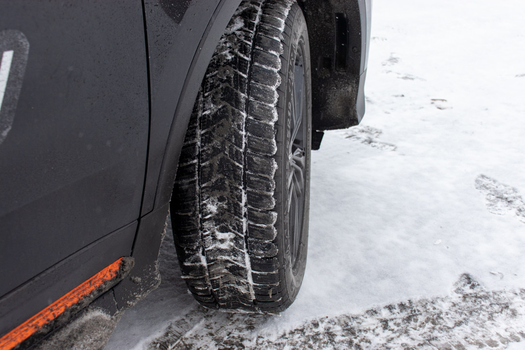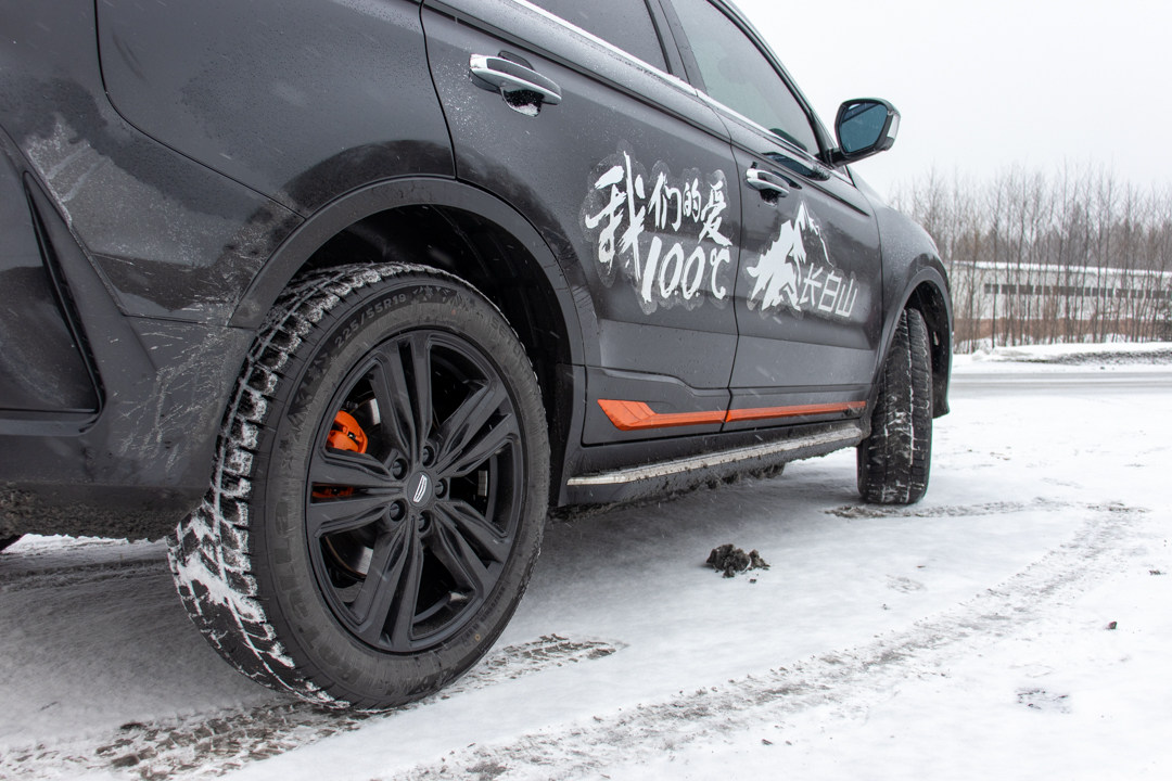 在上车前,教授就发现试驾车上已经换上了雪地胎,轮胎的胎纹呈锯齿状,中间的沟槽也更深。因为在冬季的东北地区,换一套雪地胎比拥有四驱系统还要重要!