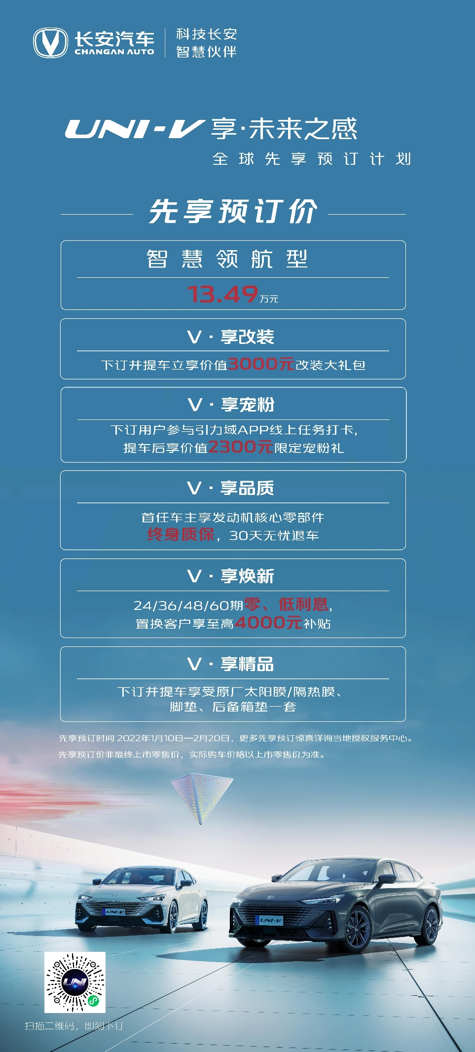 长安UNI-V全球先享预订计划于1月10日正式开启,官方发布1.5T顶配版本智慧领航型先享预订价13.49万元,下订用户在上市时可根据最终上市价格享受多退少不补尊享预订政策。同时,长安UNI-V更为用户带来多重先享预订礼,让更多消费者享受到这台“未来科技量产者”的独特魅力。